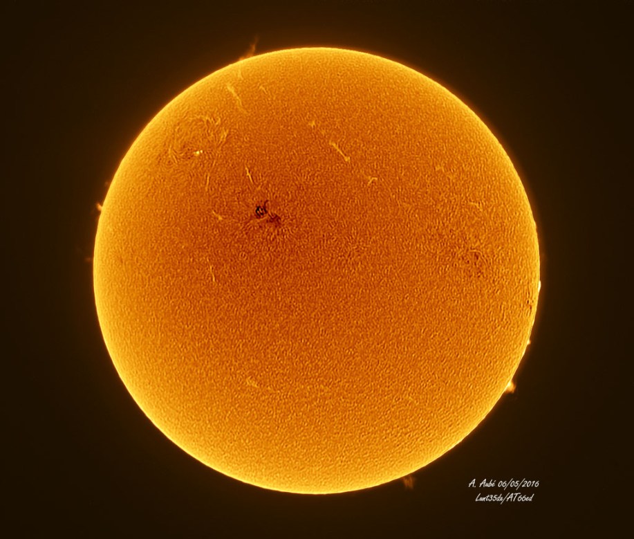 Soleil FD Lunt35&AT66 06052016 web Publié par A. Aubé le 8 mai 2016 C'est une image pour 07 Mai 2016:Soleil en Ha & essaie avec un Lunt35 Modifié – May 07, 2016: Ha Sun & Lunt35 modification tested.. Navigation des images ← Précédent Suivant →